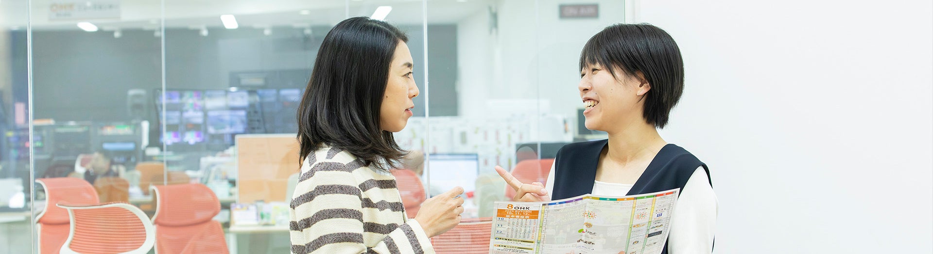 広報としては、年4回ある改編期の新番組の広報や、レギュラーでは自社番組・全国ネット番組などの全ての広報として、HPの番組情報管理、公式SNSの運用、他媒体への広告原稿の作成など、その時々で情報発信をしています。広報の大きな目標はタイムテーブルに掲載している番組全体の視聴率を上げていくことなので、そのためにはエリアの沢山の人に番組やOHKのイメージを浸透させていく必要があります。いかに効果的に広報して知ってもらえるかを考えるのが肝ですね。番組によって活用する媒体や方法も変わってくるので、ケースバイケースで考えています。