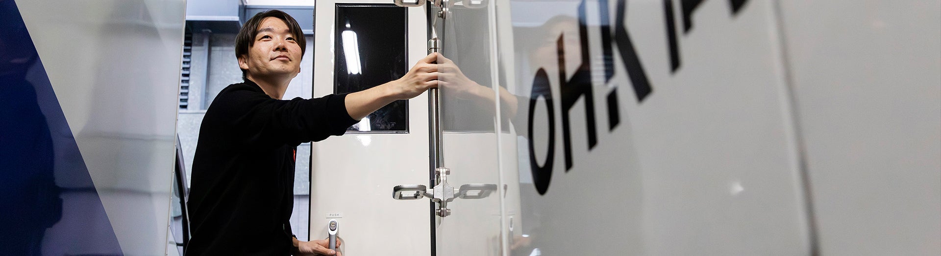 - 2017年、高専卒業後に大手鉄道会社の総合職として入社。技術部門で通信設備の保守や建設工事のプロジェクトを担当。2023年、OHKに転職。映像技術部に所属し、報道・スポーツ番組の制作技術業務、番組制作機材の保守・管理業務を担当している。