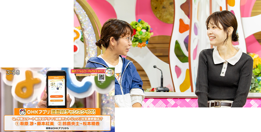 - 私はOHKアプリを中心としたデジタル展開を担当しています。生放送連動のアプリ限定クイズや、 視聴者アンケートの実施、番組の改編期にはアプリのビジュアルを番組仕様にジャックするなど、 デジタル側から番組を盛り上げています。